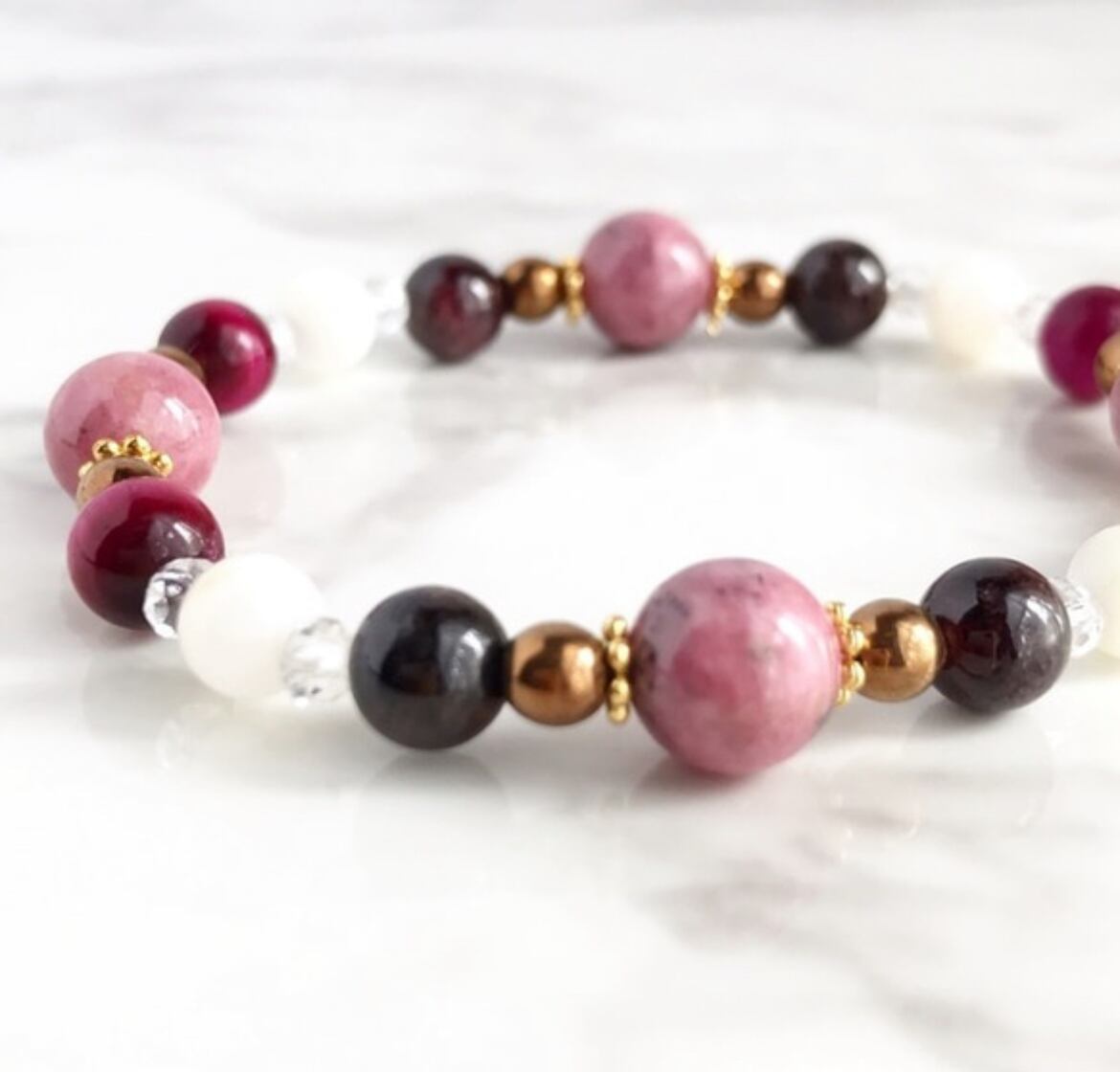 天然石ブレスレット 天然石アクセサリー 数珠 ハンドメイドアクセサリー ロードナイト ピンクタイガーアイ ガーネット マザーオブパール 水晶 ヘマタイト 愛情 友情 良縁 対人関係 人間関係 友達 友人 女性へのプレゼント ギフト
