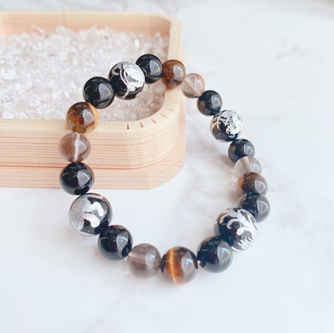 ✦ 【再販30点以上】四神の調和を象徴 天然石ブレスレット|オニキス・タイガーアイ・スモーキークォーツ No.187