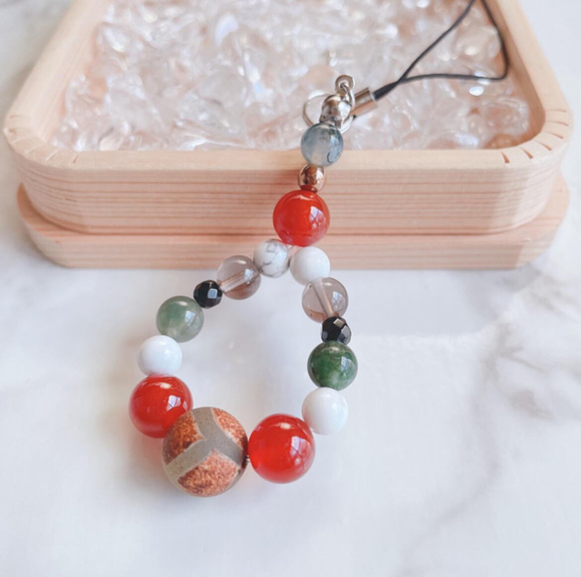 ✦ 生命の循環を象徴する亀甲長寿天珠ストラップ|赤メノウ・スモーキークォーツ・ハウライト No409S
