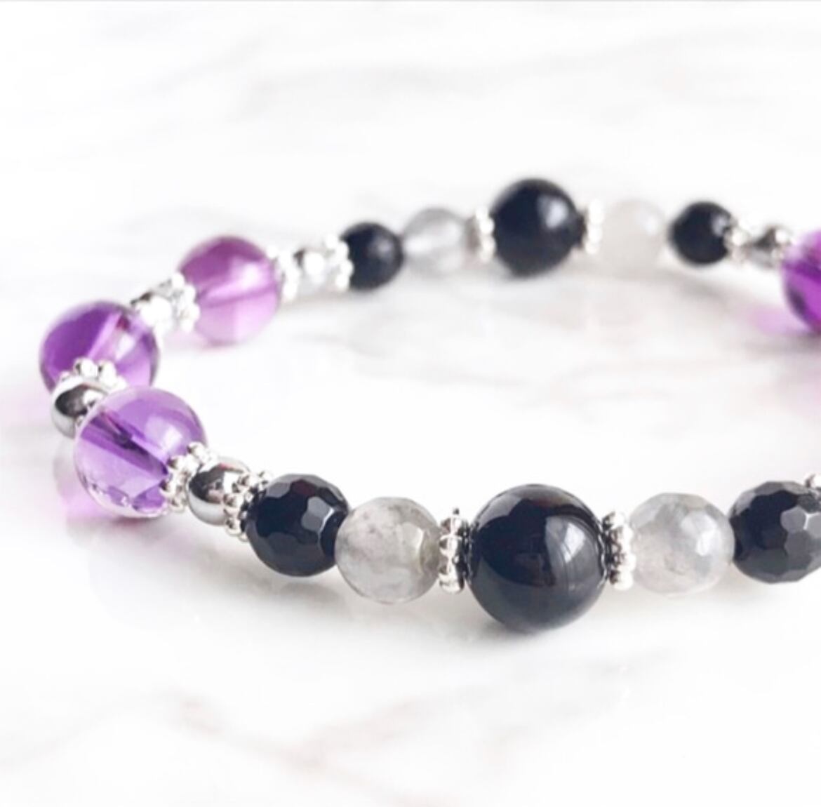 ✦ 人間関係の悩みから心を守る 天然石ブレスレット|アメジスト・オニキス・クラウディクォーツ No.18