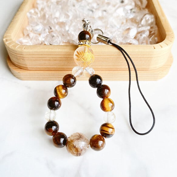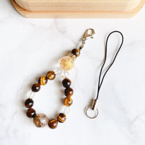 ✦ 金龍 新たな道を切り拓く 天然石ストラップ|金龍彫り水晶・ルチルクォーツ・タイガーアイ No341S