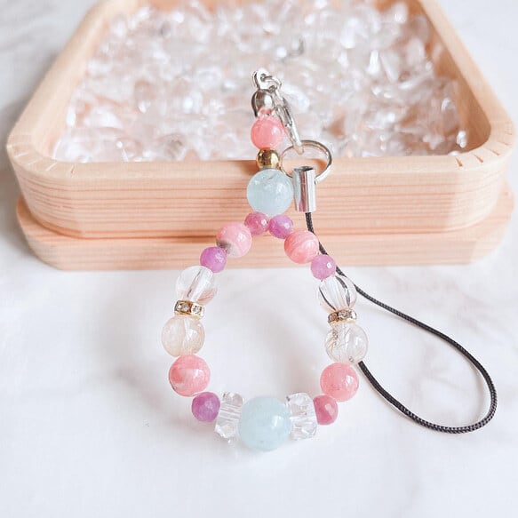 女性に嬉しい華やかさを纏う 天然石ストラップ|アクアマリン・インカローズ・ルビー・水晶 No428S