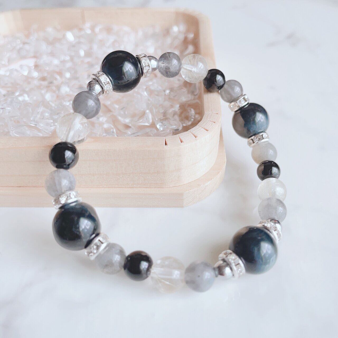 ✦金運を高め、不運を寄せ付けない守護の石 天然石ストラップ|ホークスアイ・モリオン・ラブラドライト・ルチル No881S